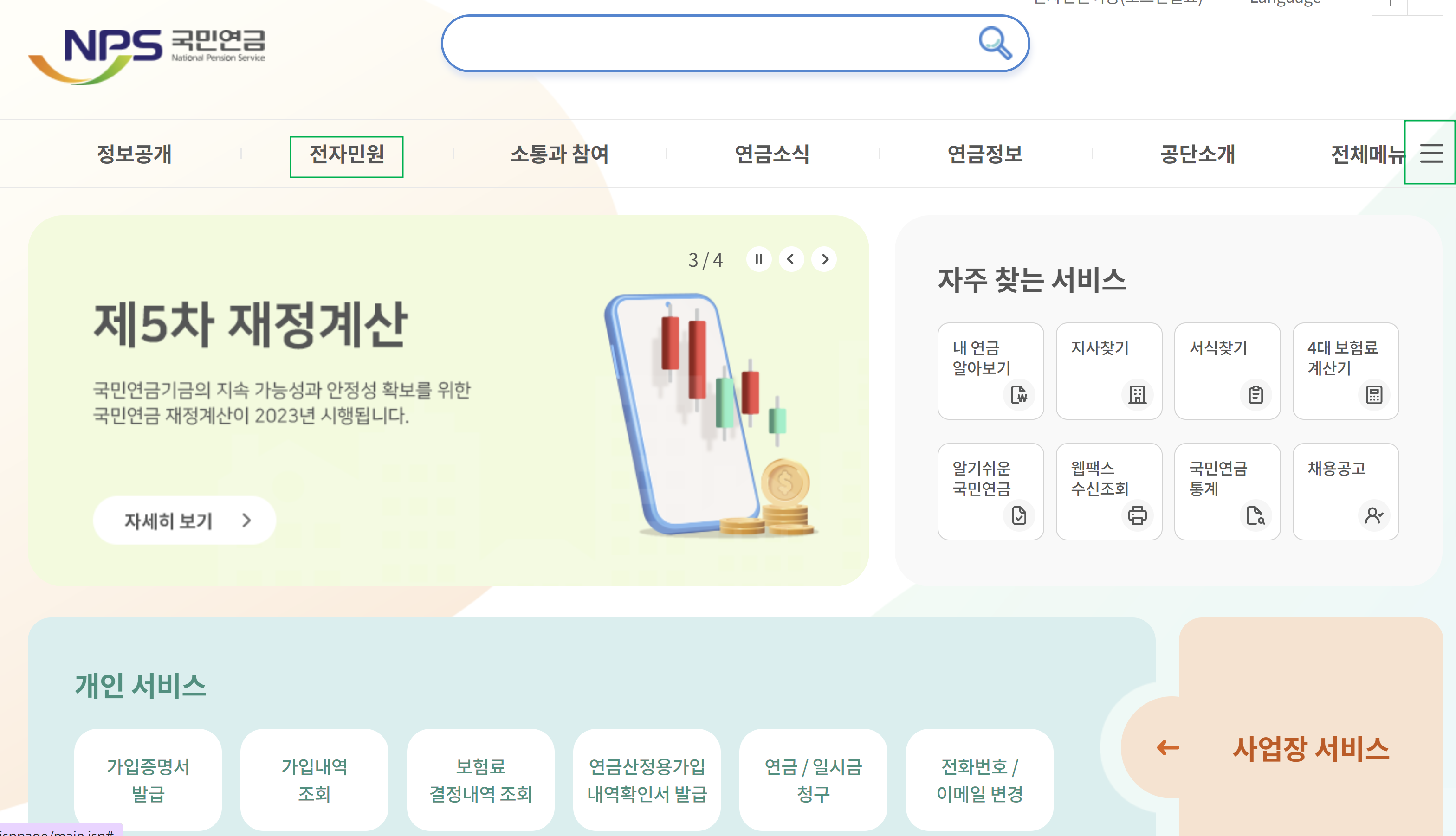 1. 국민연금 공단 홈페이지에 접속합니다.