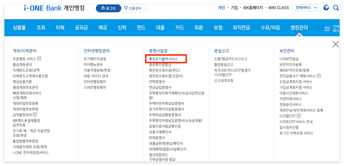 IBK기업은행 앱(i-ONE)을 설치하여 로그인 하면 통장사본 발급이 간편하게 가능합니다.